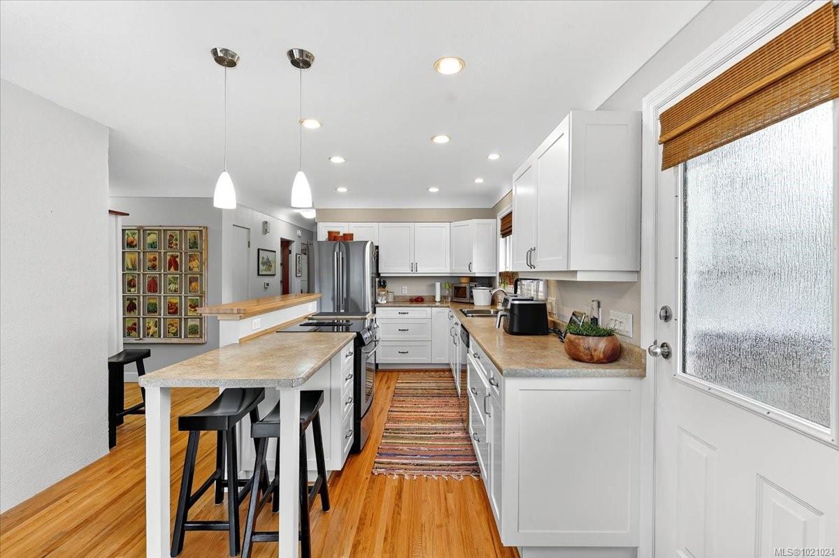CHARMING MID-CENTURY MODERN UPDATED HOME ~ originally built in 1962, now fully refreshed for today's lifestyle. This wonderful residence features three spacious bedrooms and one full bath on the main level, perfectly designed to accommodate both comfort and functionality. The open floor plan seamlessly connects the kitchen with stainless steel appliances, dining room, and living room, creating an inviting space ideal for entertaining or relaxing with family. The living room boasts a cozy gas insert fireplace and large picture windows that flood the space with natural light, highlighting the home's unique character. Venture to the partially finished basement, where you'll find a large recreation room that can easily be utilized as an additional bedroom. This versatile space is complemented by a full updated bathroom, a generous laundry room, a storage room, and a workshop, providing ample room for all your needs Step outside to discover a lovely private back deck, perfect for outdoor gatherings or quiet mornings with a cup of coffee. The home's expansive .34-acre lot offers plenty of space for outdoor activities and gardening. Few other key items to know ~ oak hardwood floors, gas furnace, vinyl windows, hot water tank 2024, membrane roof, copper plumbing, irrigation system & wired large garden shed. Don't miss the opportunity to make this delightful home your own—it's truly a must-see!